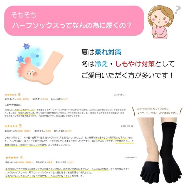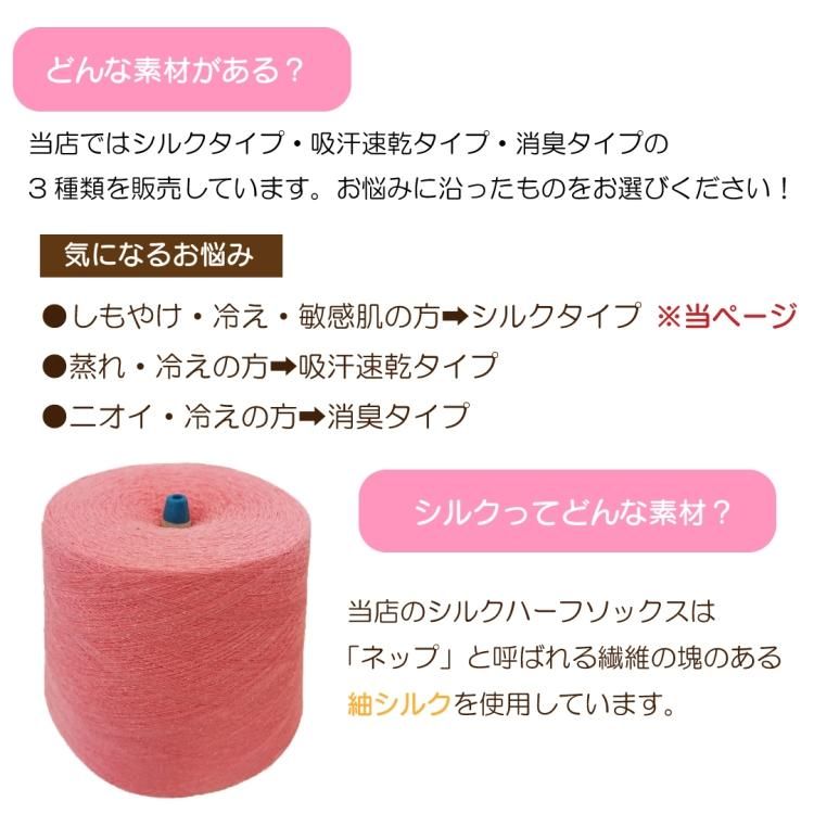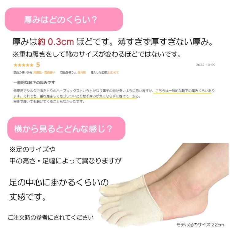 柔らかい手触りのシルクでした。ハーフソックス初めて履きましたが、じんわりぬくくていい感じでした。冷えを自覚していませんでしたが、意外と冷えがちなのを実感しました。 自分のケアの為に履いている感じがして癒されました。指先だけの靴下なんて靴下上級者だと思っていましたが、試す価値あり。
