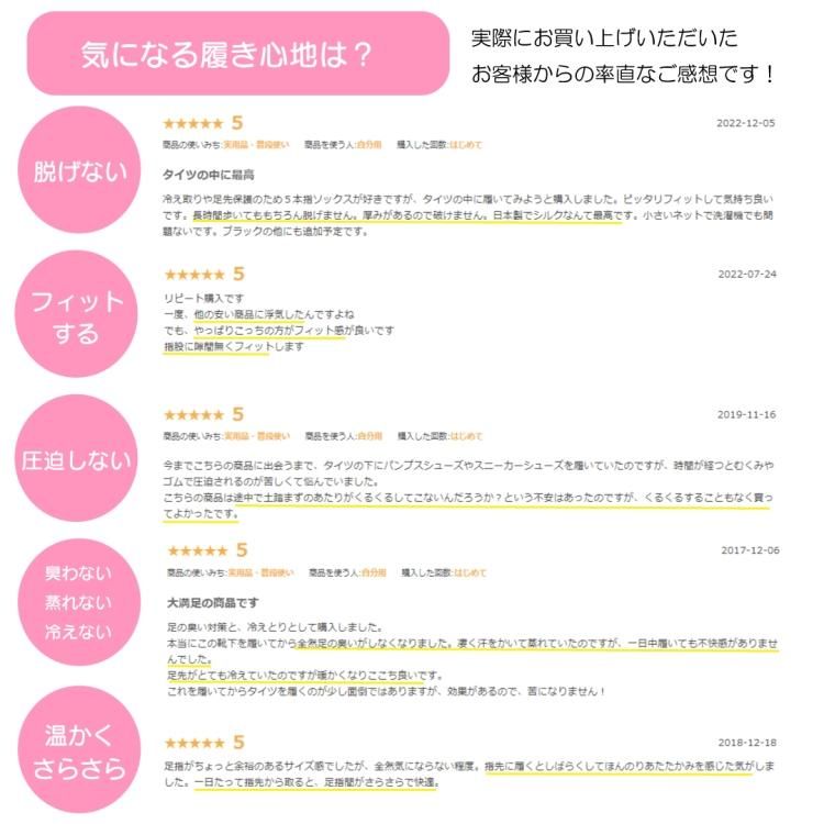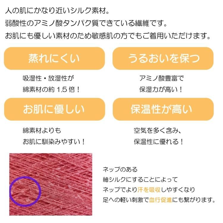 馬油やぼたん油との併用でしたが、他メーカーさんよりもシルク自体の保湿性が高いと思いますし、一見、太過ぎに感じる指先も重ね履きした時のキツさや締め付けがないので、肌が敏感になっている時でも抵抗なく履けました。