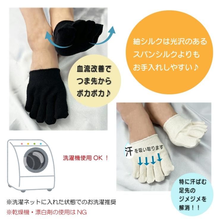 今回シルクのつま先5本指ソックスを体験しました。サラサラの肌触りが気持ち良い!脱いた後の足指先のサラサラ具合も良い!流石シルクです。ただ耐久性はどうなのかな? 以前こちらの会社のシルク製タビソックスを使用していたのですが、綿に比べると耐久性が弱い。使用感は抜群ですが、直ぐに踵に穴が空いてしまいました。が、こちらの商品はつま先だけ。踵がないのでタビソックスよりは長く使えるかも。