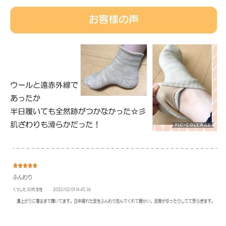 とても優しい暖かさ。足首に締め付けがないので血行が滞らず快適です。また、ベージュ、グレーの淡い色合いがすごく気に入りました。3色セットを購入してよかったです。ありがとうございました。